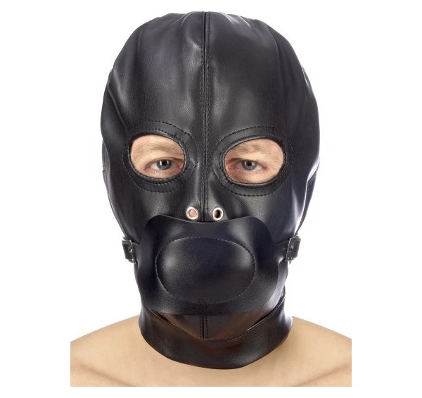 Cagoule BDSM avec bâillon amovible en silimi-cuir (imitation cuir) avec laçage à l’arrière de la tête et d’une sangle de serrage au cou, le tout ajustable.
