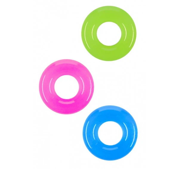 « Glow in the dark » signifie « Lueur dans l’obscurité » est un lot de 3 cockrings fluorescents extensibles en emballage individuel.